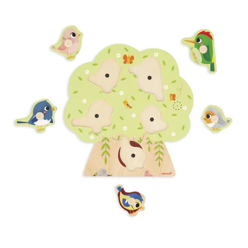 - Wooden sound puzzle in the shape of a tree, suitable for ages 18 months and up