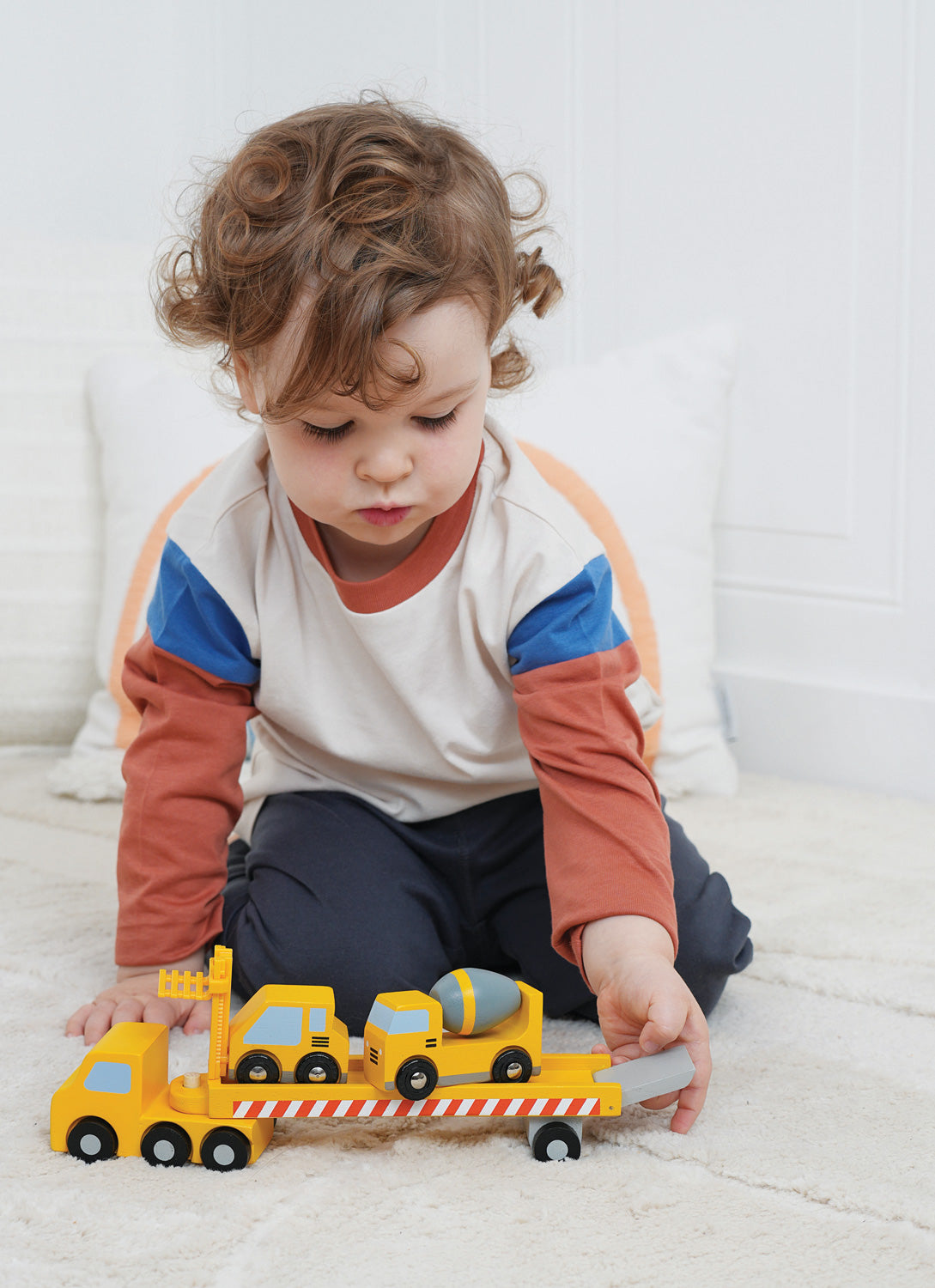 Enter the worksite and get ready to build years of imaginative adventures with this heirloom-quality wooden construction vehicle transporter! Hook the flatbed trailer onto the cab, lower the ramp, drive the cement mixer and forklift onboard, and roll off to the next building site! Combine with household block sets for more open-ended play adventures. From Mentari for ages 3+ yrs.