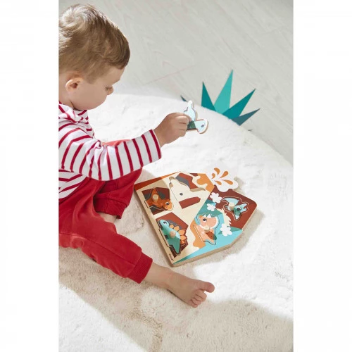 A puzzle… that makes noise! This wooden sound puzzle, with a dinosaur theme, is ideal for children from 18 months old. Composed of 5 peg-on pieces, it has been designed for curious little hands. The pieces, with rounded edges and wooden pegs, are easy to grasp and manipulate. This developmental toy is perfect for stimulating fine motor skills, logic, and auditory acuity from a very young age! Each piece represents a dinosaur: Tyrannosaurus, Diplodocus, Triceratops, Pteranodon, and Stegosaurus. Once the piece is correctly placed, simply press it to hear the corresponding dinosaur’s roar. A fun activity that immerses the child in a fascinating world, populated by prehistoric creatures and an erupting volcano! With its convenient 24 x 25 cm size, this sound puzzle is made of FSC™ certified wood. Ready for a sound adventure in the time of the dinosaurs?
