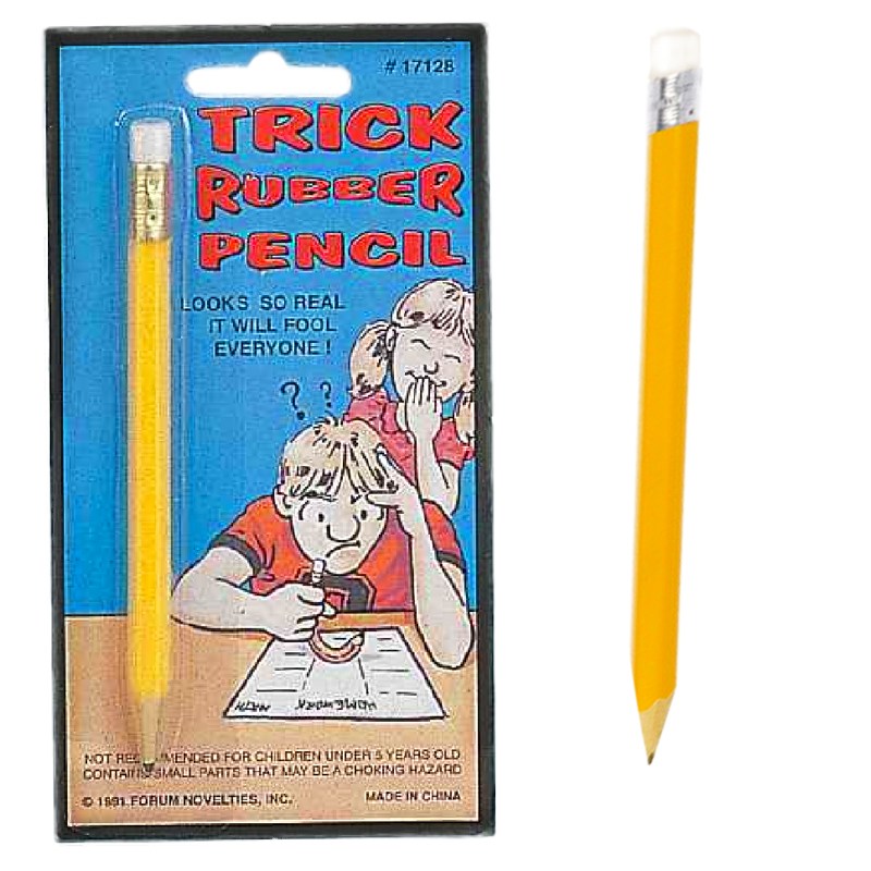 Bends when you write. Made of solid rubber, and topped with an eraser. Looks real enough to fool your friends.