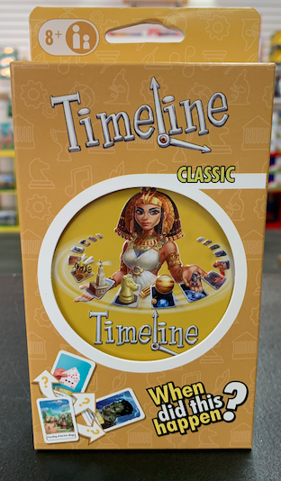 Timeline is a card game where each card depicts a historical event, invention or discovery on both sides, with the year in which that event occurred, invention or discovery was made on only one side. Players take turns placing a card from their hand in a row on the table. After placing the card, the player reveals the date on it. If the card was placed correctly with the date in chronological order with all other cards on the table, the card stays in place; otherwise the card is removed from play and the player takes another card from the deck.